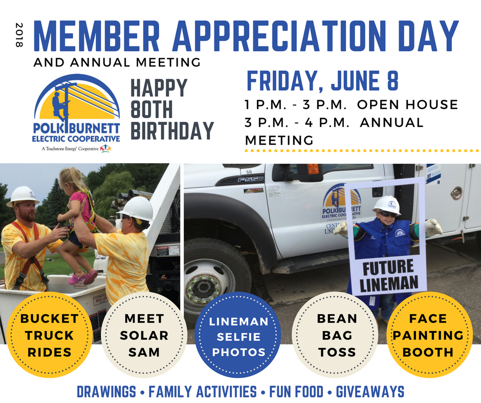 Mark your calendars for our 80th Annual Meeting & Member Appreciation Open House Friday, June 8, 1 – 4 p.m. at Polk-Burnett Electric Cooperative, Centuria