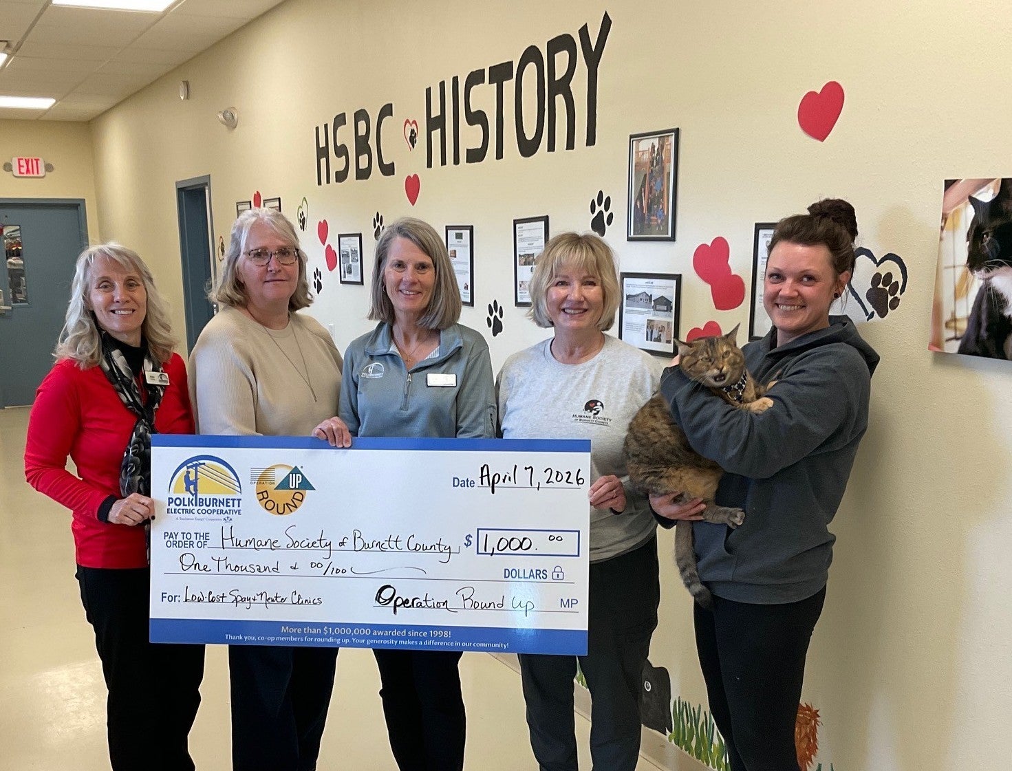 Above: Polk-Burnett’s Operation Round Up awarded $1,000 to support the work of the Humane Society of Burnett County (HSBC). Funds will be used to help lower the cost of spay and neuter clinics in our community.