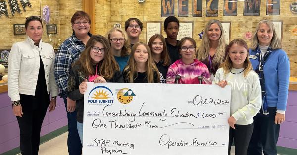 Polk-Burnett Electric Cooperative’s Operation Round Up awarded $1,000 to Grantsburg Community Education for its STAR Mentoring Program, where students in grades K-8 are paired with adult mentors from the community. Mentors and students connect in the spring and fall for one-on-one and group activities.